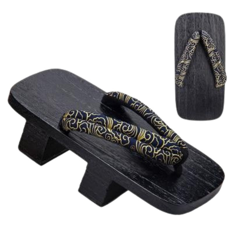 The traditional Japanese sandals known as "geta" have two platforms or prongs and make a distinctive clacking sound on the ground when worn, their straps are navy colored with a baroque pattern to contrast with the dark, stained wood of the soles. These unisex Japanese sandals are a must-have in Japan and have been ingrained in the culture for centuries!