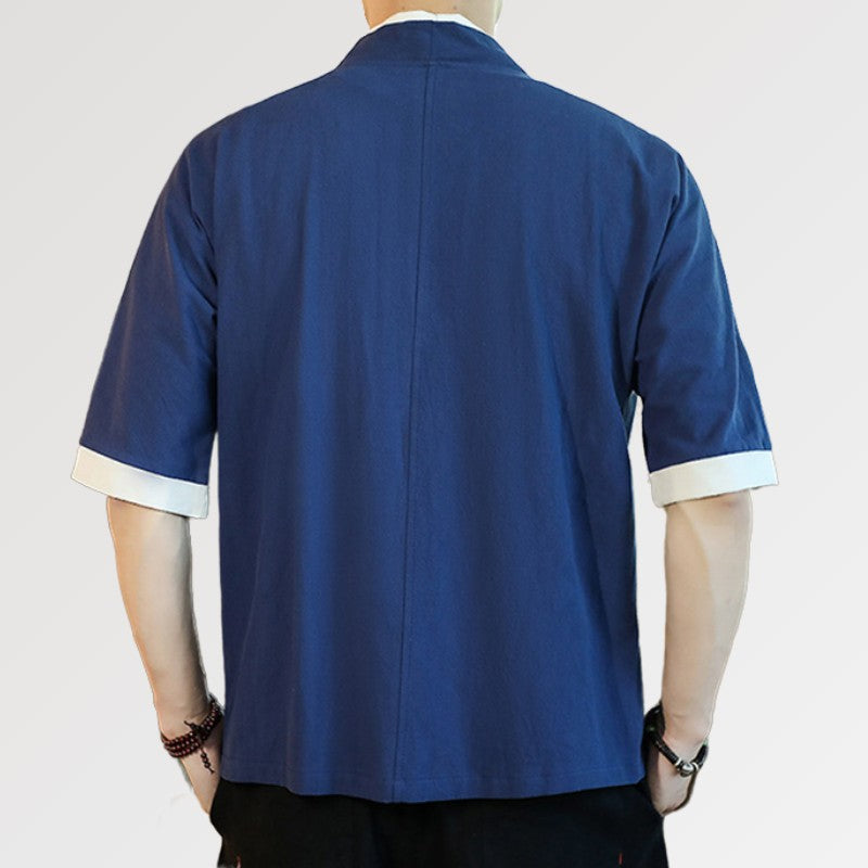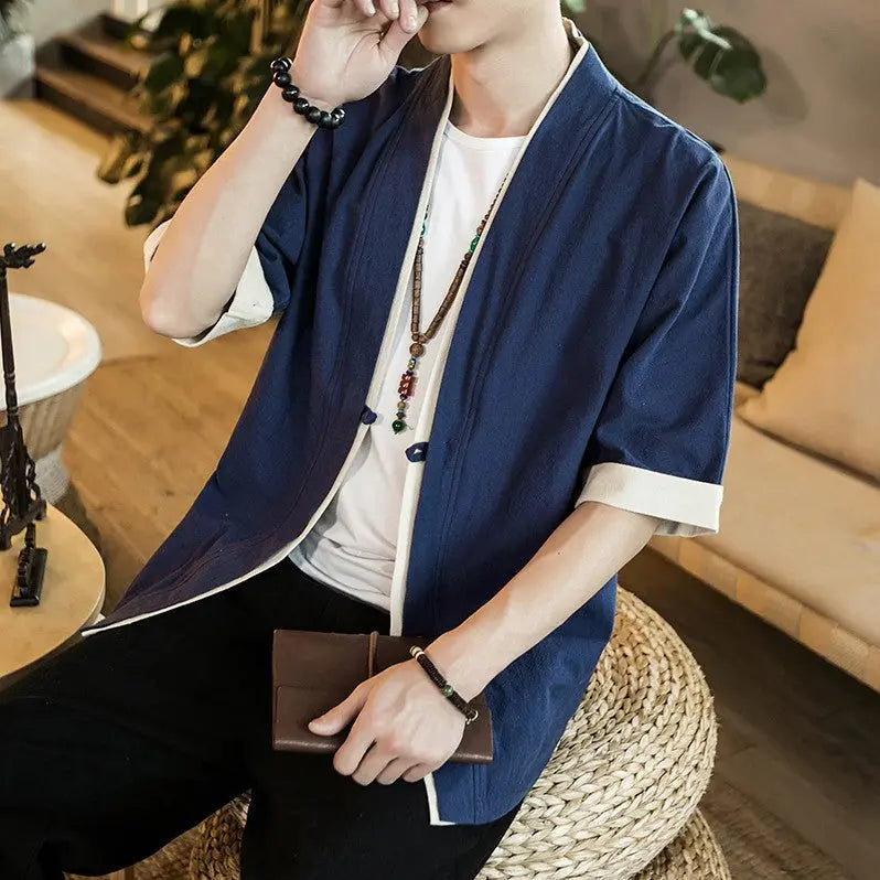 The men's kimono jacket is a traditional garment that has been around for centuries. Made of cotton and linen, these loose-fitting garments allow you to cool off in style or wear them casually with your favorite jeans (favor shorts for summer)! This one has a symmetrical, oversized fit so it will be perfect during the summer months when comfort reigns supreme over meticulously tailored shapes