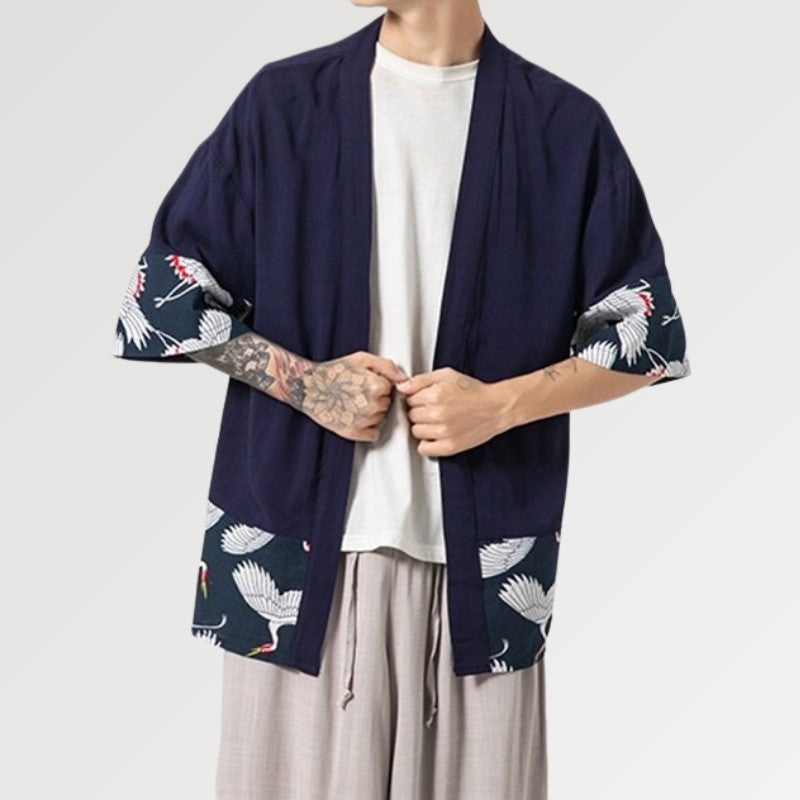 This men's kimono style cardigan is made of high quality cotton and linen, ensuring that it is soft, comfortable and breathable. Its straight fit is perfect for a summer outing or relaxing at home. The white crane pattern on the fabric is symbolic of good luck as well as prosperity in Japanese culture and makes this piece a timeless addition to your wardrobe. Plus its mid-length sleeves will let your body breathe in light breezes!
