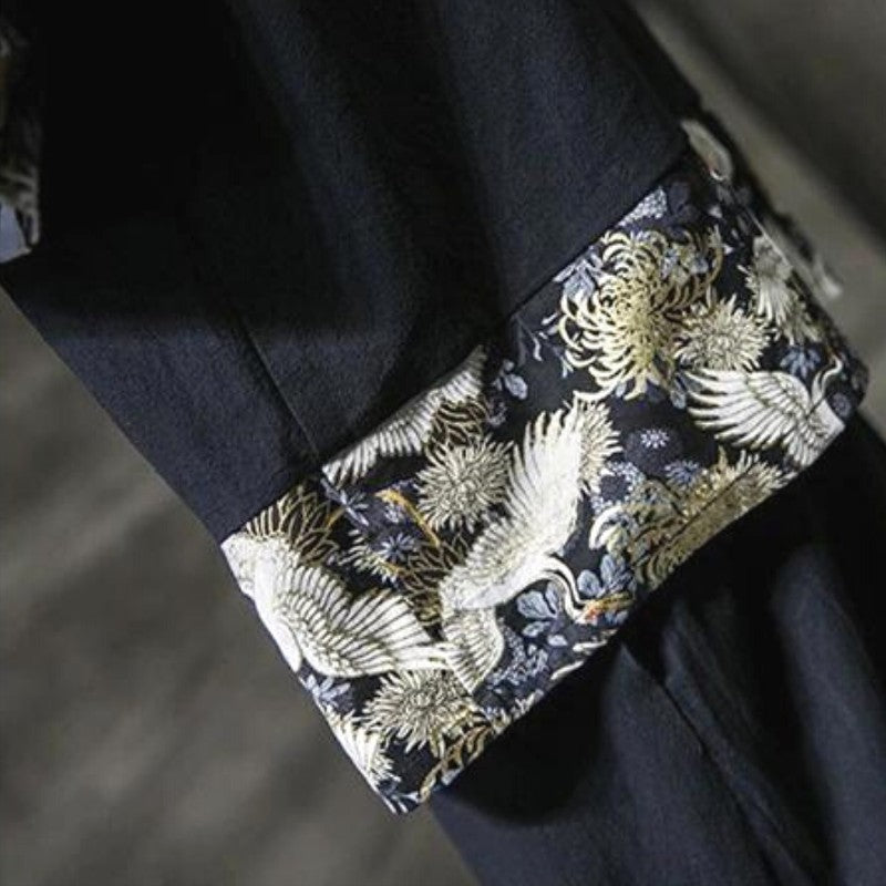 The men's kimono shirt is a stylish and comfortable Japanese garment made of cotton and durable linen. The straight, slightly oversized cut makes it a traditional garment perfect for beach outings or relaxing in your free time. Plus, the soft, consistent fabric ensures a comfortable feel all day long. Adorned with crowned cranes and a traditional Japanese pattern, this shirt is a great addition to any man's wardrobe.
