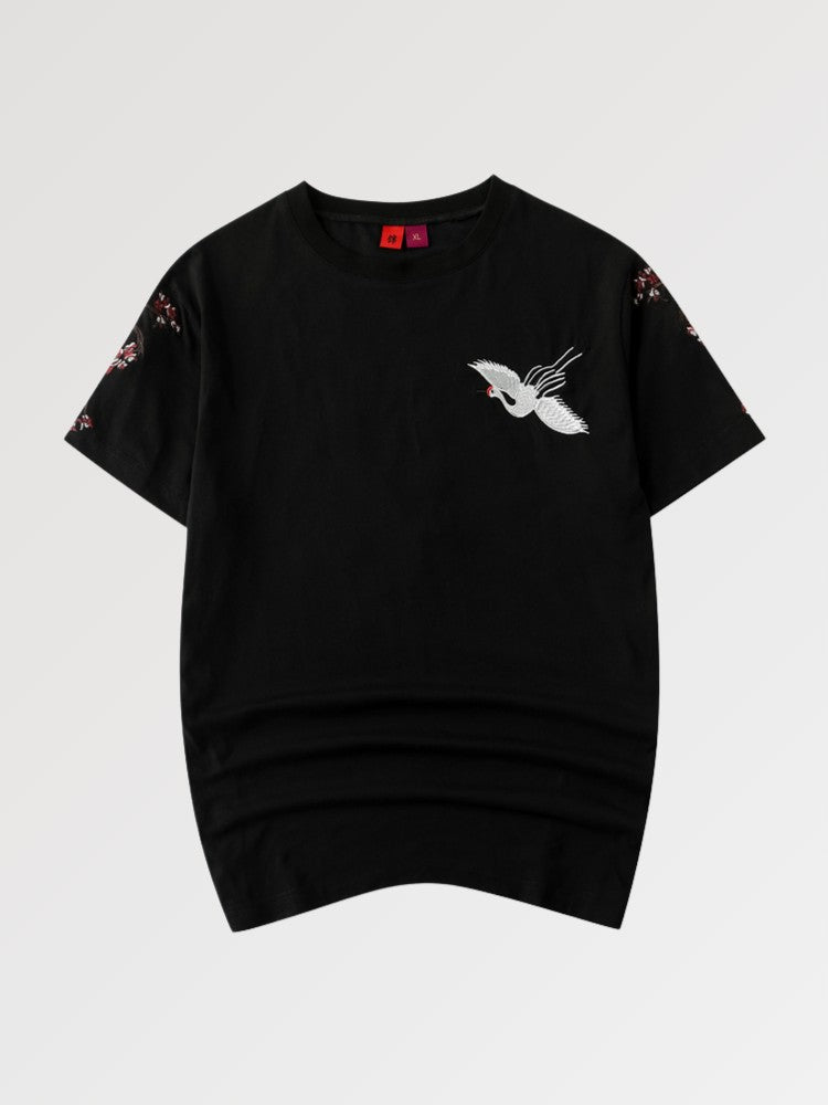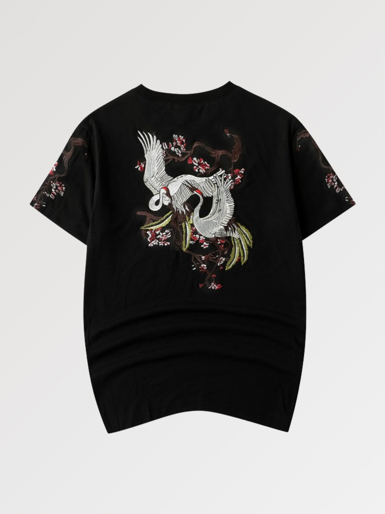 The crane print t-shirt is a must have for anyone who wants to have a modern yet traditional look. We love the interesting sleeve design with its embroidered pattern. One thing is for sure: you'll be garnering lots of compliments in no time with these spectacular designs from our store!