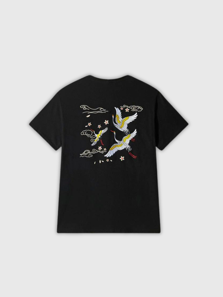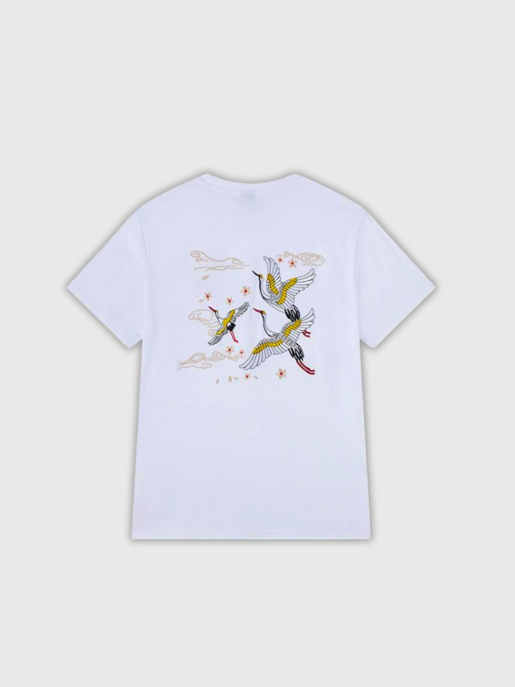 The perfect unisex t-shirt for those who love the feel of cotton on their skin and like to show off some fashion sense. This oversized t-shirt can be worn loose with straight or tight pants, depending on what you're looking for in terms of Japanese streetwear style! The design features three cranes flying over a stormy sea in reference to Hokusai's Wave of Kanagawa.