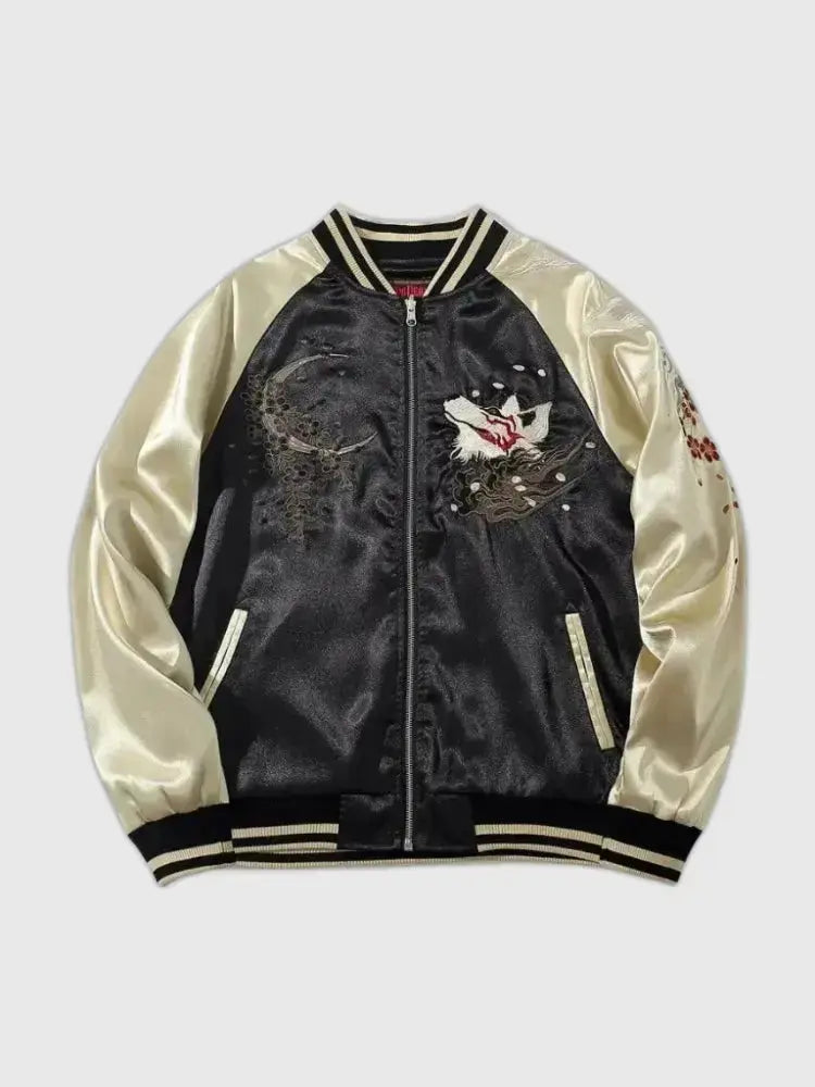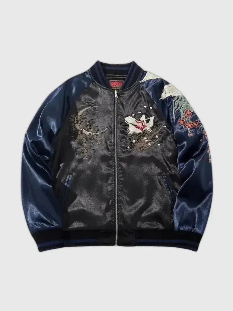A true ode to Japanese art, the Sukajan Kitsune is distinguished by its illustrations of foxes and lush flowers, symbols of cunning and beauty in Japanese culture. The finely embroidered motifs on the satin fabric captivate the eye and demonstrate remarkable attention to detail. Inspired by the traditional Japanese jackets worn by American soldiers after the Second World War, this bomber is now a streetwear icon with an exotic twist. Ivory-colored sleeves contrast elegantly with the jacket's black body, while ribbed trims ensure a clean, tailored silhouette.