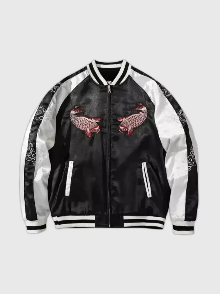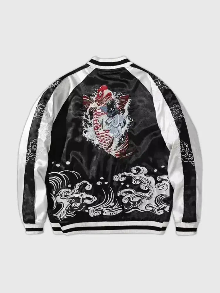 With beautiful embroidery depicting koi carp, symbols of luck and perseverance in Japanese culture, this Sukajan Koi jacket captures the spirit of carp climbing waterfalls, a popular theme in Asian art. The striking contrast between black satin and white satin sleeves highlights the detailed fish and wave design, making each piece unique. Perfectly rooted in Harajuku style, this garment is a top choice for those looking to incorporate elements of Japanese street fashion into their wardrobe.