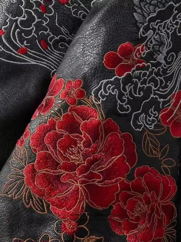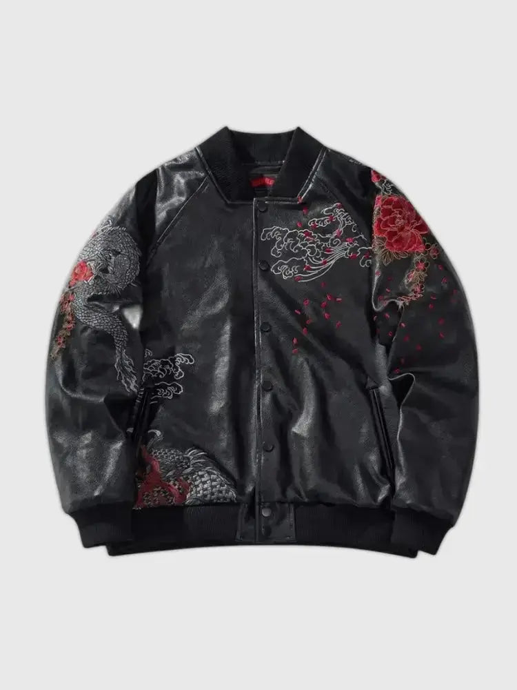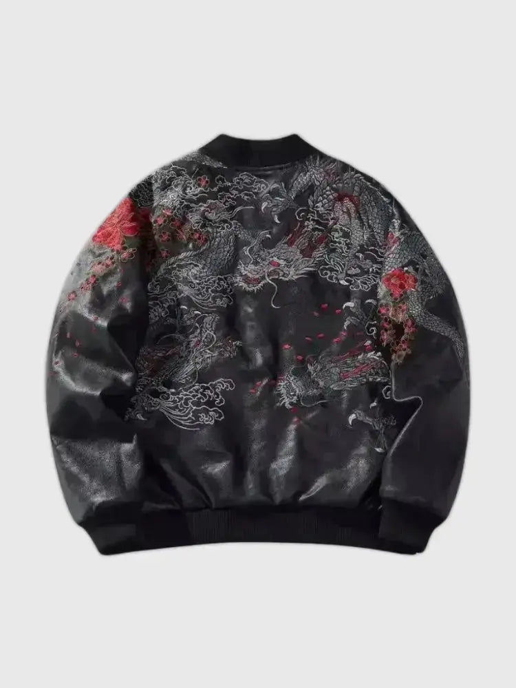 The Sukajan Authentique, nicknamed 'Akaryu', is a collector's item that embodies the spirit of Harajuku style with its striking design. Careful embroidery depicts dragons intertwining among scarlet blooms, symbolizing passion and vitality. This satin jacket evokes Japanese aesthetics with a contemporary twist, paying homage to traditional Irezumi tattoos. Each thread is woven with meticulous care, reflecting remarkable craftsmanship. The contrast between the deep black of the fabric and the vibrant red motifs gives this jacket a classic yet bold allure, ideal for a bold Japanese fashion statement.