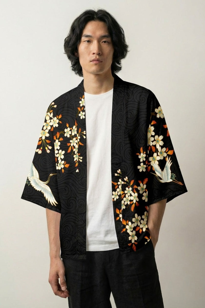 Japanese haori with multiple symbols such as the crane, cherry blossoms or the setting sun