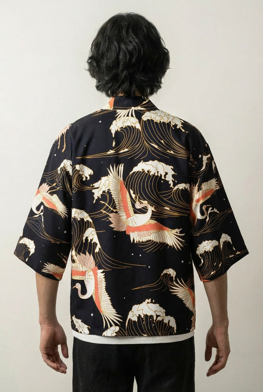Cardigan in a modern haori style representing cranes flying over the sea